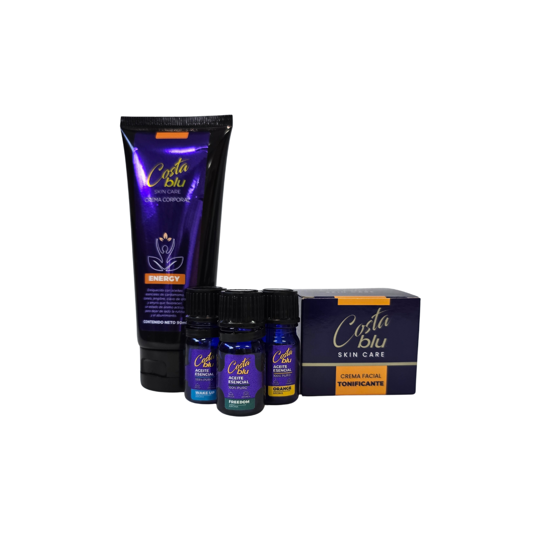 El Kit Inicial Costa blu es tu primer paso hacia el autocuidado consciente. Incluye una crema corporal de 90 ml, tres aceites aromáticos de 5 ml y una crema facial para crear rituales diarios de bienestar y calma.