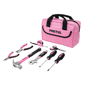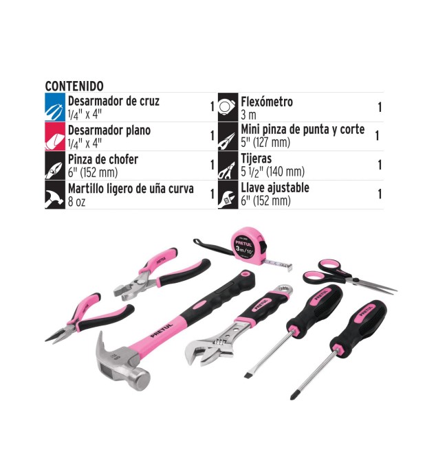 Juego casero de herramientas para dama, 8 piezas, Pretul. Mangos Comfort Grip. Incluye maletín