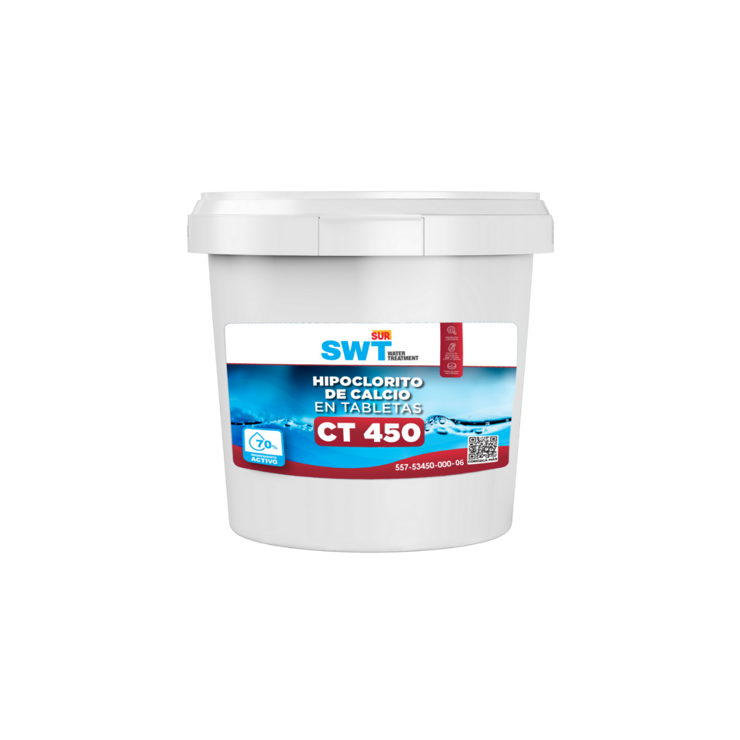 El Hipoclorito de Calcio en Tabletas CT 450 es un desinfectante de alta concentración, formulado para el tratamiento y acondicionamiento de aguas. Contiene un alto porcentaje de cloro disponible, eficaz para eliminar bacterias, virus y algas. Es ideal para el mantenimiento de piscinas, así como para el tratamiento de aguas residuales y usos industriales. Su presentación en tabletas comprimidas facilita una dosificación controlada y segura, garantizando una desinfección constante y eficiente cuando se utiliza según las recomendaciones técnicas.