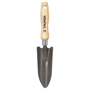 Transplantador para jardín, 6". Fabricado en lámina de acero al carbono. Mango fabricado en madera de fresno. Casquillo metálico que refuerza el encabado
